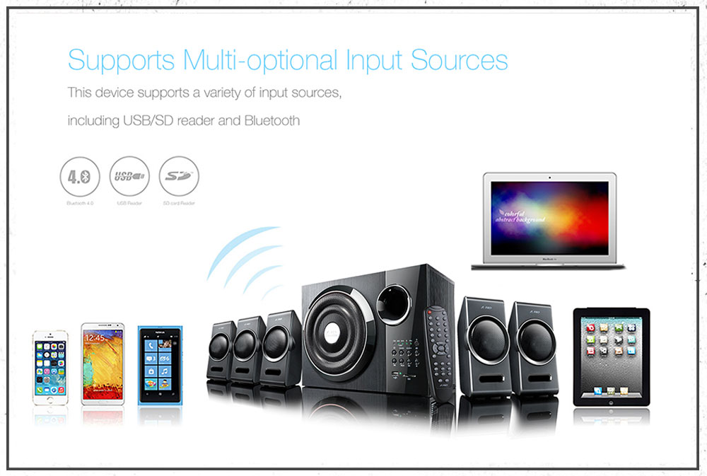 Bluetooth audio system with 5 sattelite speaker with USB , SD card. We, Fenda Audio India Private Limited are a reputed supplier, importer and distributor of Home Theater System, Wireless Bluetooth Speakers, Multimedia Speaker System, Audio Systems, Media Speaker Tower; in different models. Wireless Bluetooth Speakers, Multimedia Speaker System, Audio Systems, Media Speaker Tower; in different models.