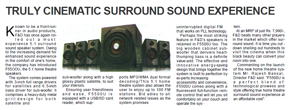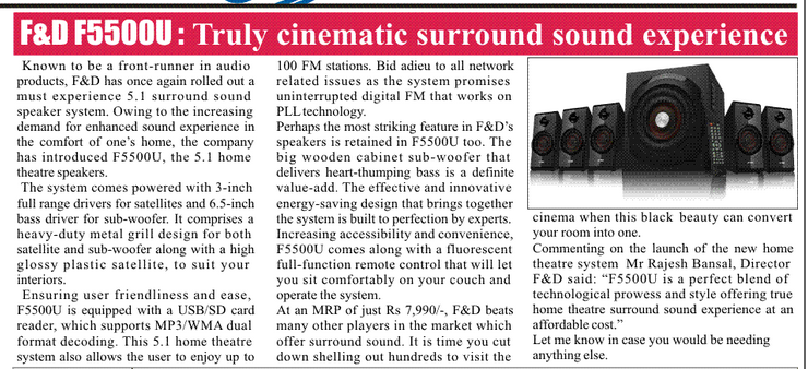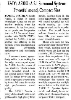 Headline: F&D’s A530U –A 2.1 Surround System– Powerful sound, Compact Size