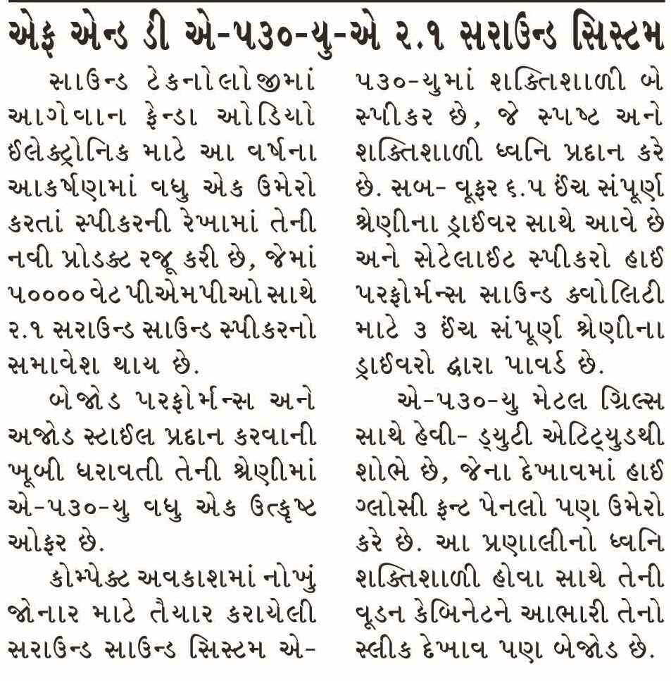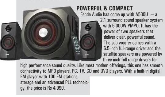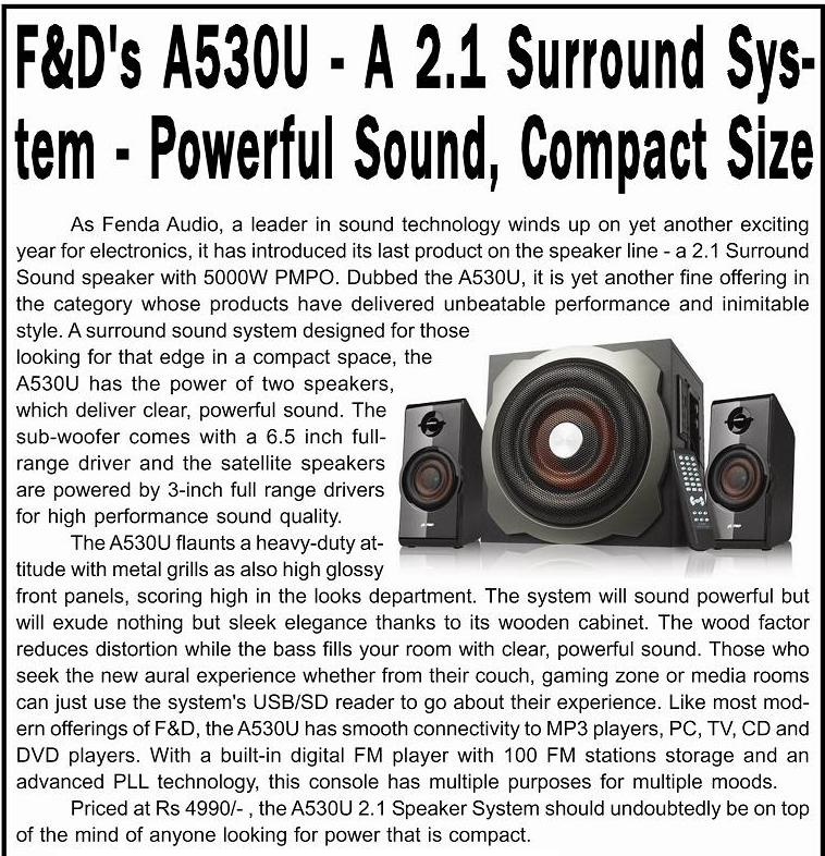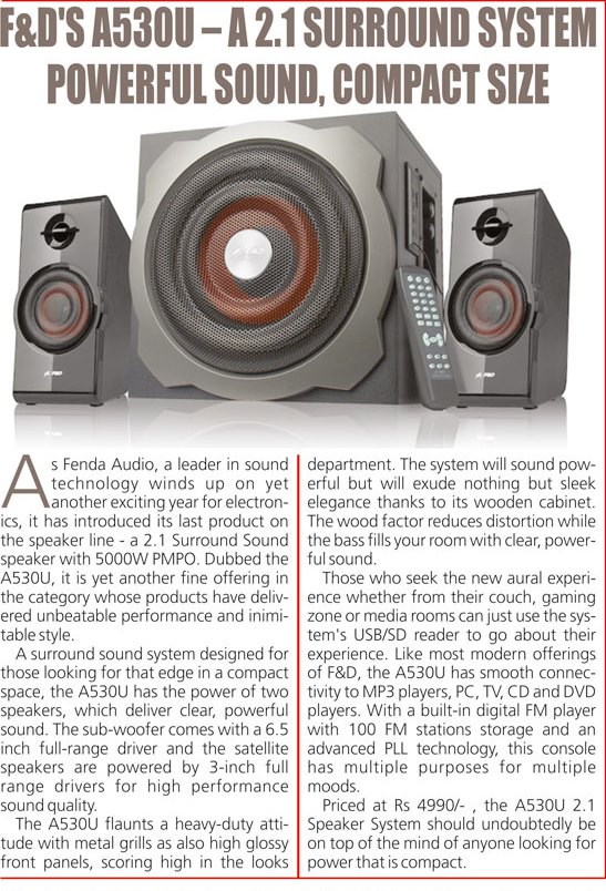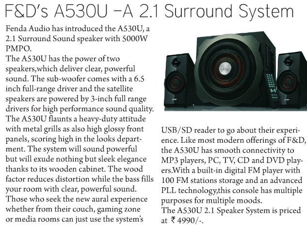 Publication: Shoolini Samachar Headline: F&D's A530U –A 2.1 Surround System– Powerful sound, Compact Size