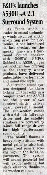 Publication: Afternoon Voice Headline: F&D's A530U –A 2.1 Surround System– Powerful sound, Compact Size