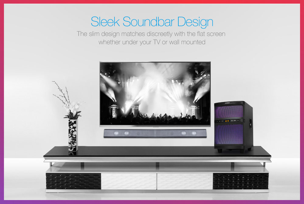 2" full range driver and 8" subwoofer driver. Sleek soundbar fits discreetly under your flat panel TV. Two slim satellites can work separately or combine together to a soundbar. Innovative automatic multi-colour LED on subwoofer. Crystal clear sound and heart thumping bass. Bluetooth 4.0 version. Bluetooth operation range works at up to 15 meters. Plug and play USB/SD card reader.